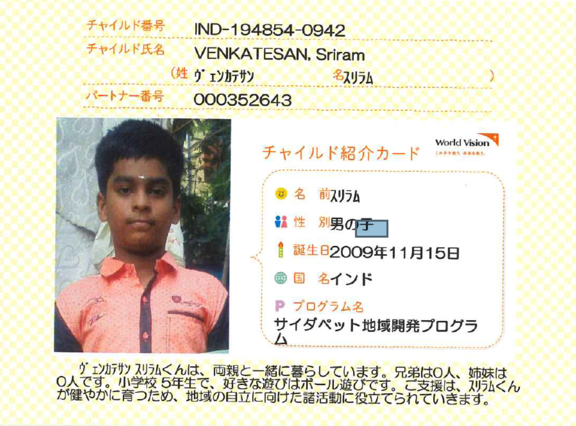 兄弟は0人、姉妹は0人です。小学校5年生で、好きな遊びはボール遊びです。ご支援は、スリラムくんが健やかに育つため、地域の自立に向けた諸活動に役立てられていきます。