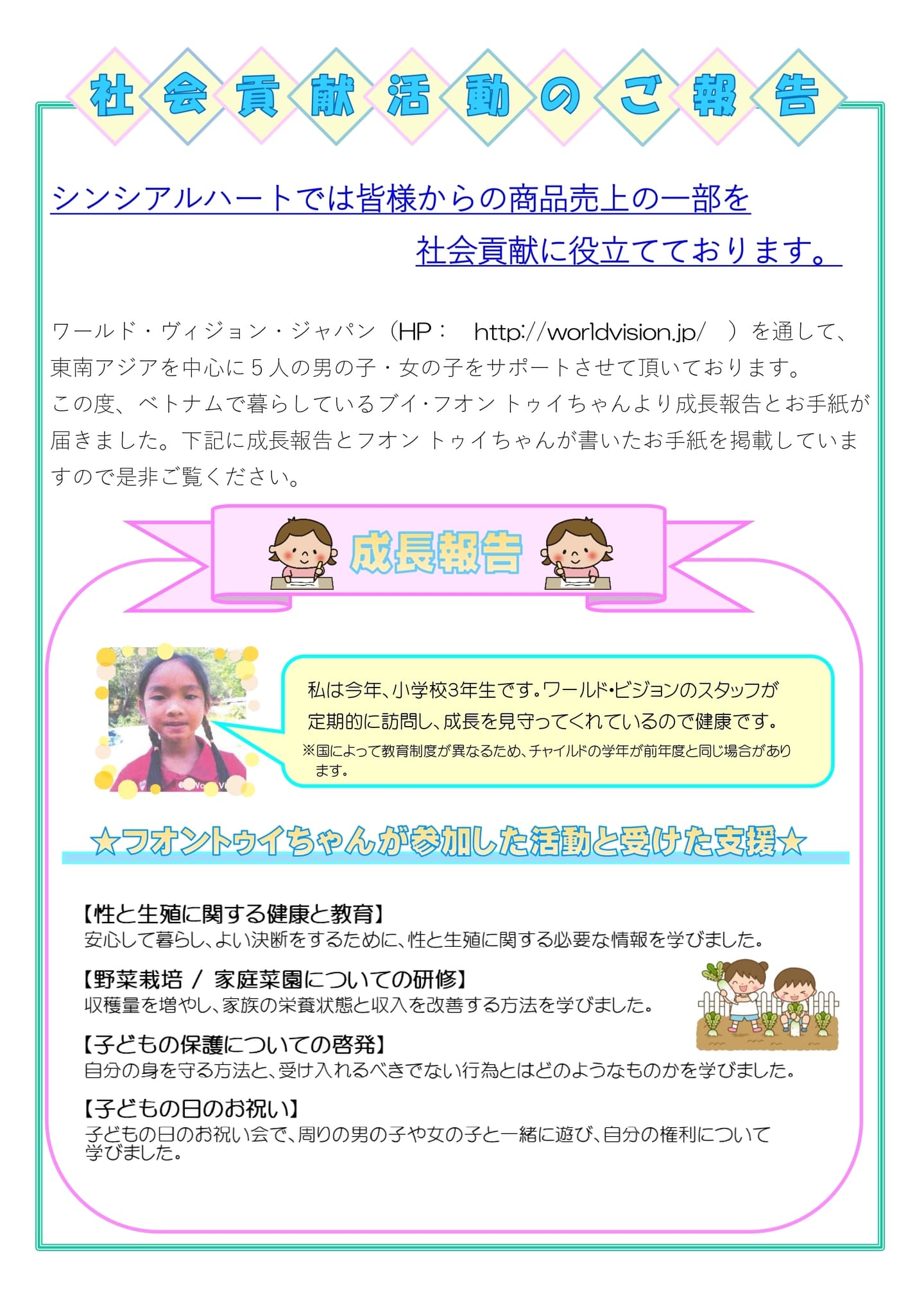 下記に成長報告とフオン トゥイちゃんが書いたお手紙を