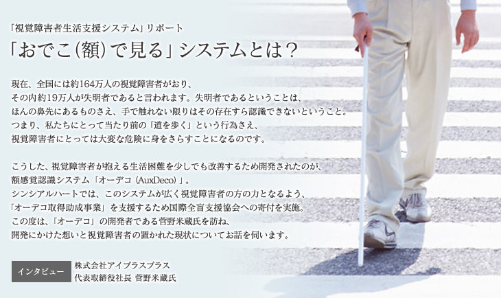 まずひとつめは、今のところ税込で1台あたり126万円と非常に高額であることです。もちろん、我々としてもコストを下げる努力をしていますが、これもやはり数との勝負になるわけです。現在は100台という極少ないロットで製造委託しているため、コストが非常に高くなってしまう。何とか量産効果が出るところまで普及を高めないと、コストを下げることが出来ないのが現状です。国や地方自治体の助成金も期待されるところですが、前例のない製品であり、実績もまだこれからですから、認可が下りるのはまだ先になりそうです。ユーザー数を少しずつ上げて国に実績を認めてもらうには、今回シンシアルハートさんにご寄付いただいた国際全盲支援協会のように、まずは購入支援事業を行う民間の社団法人の存在が必要不可欠でもあるのです」