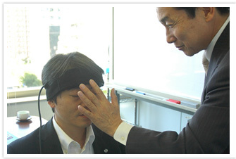 中山社長がオーデコを体験。菅野さんが手をかざすヘッドバンドの中央には小型カメラを内蔵。取り込まれた映像の輪郭を電気信号に変え、その情報を軽い電気刺激によって額へ送信します。額に感じるぴりぴり感を繋いで物体の形を認識。縦棒、横棒のかたちは難なくクリアした中山社長。菅野さんから「センスが良いですね!」とお褒めの言葉をいただくも、△の形には苦戦の模様!