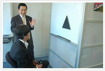 「その一号機のテストを最初にお願いしたのが、千葉盲学校の生徒さんたちでした。テストは、目の前のホワイトボードに30センチ程度の棒状、あるいは三角などの黒いパネルを貼り付けて、その形を認識できるかどうかをチェックします。