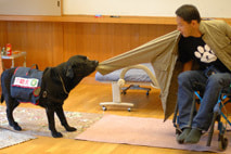 2歳の女の子のメリーは、3頭のなかで一番の新人。現在は車いすの段差介助、床に落ちたものを拾い上げて手元におく介助、バックなどをくわえて運びながら付いてくる訓練などをしています。なかでも、落ちたものを拾う、という動作は、肢体不自由者の方が絶対に必要とする動作。介助動作の訓練では、基本中の基本なのだそう。